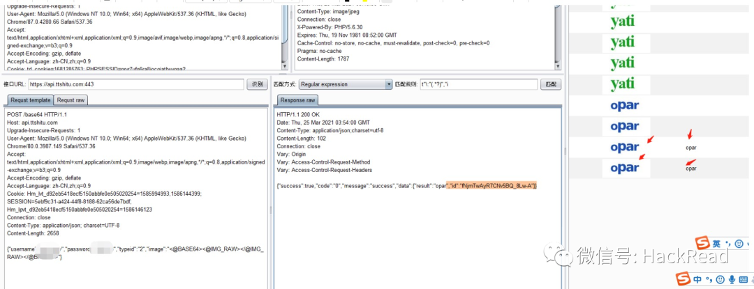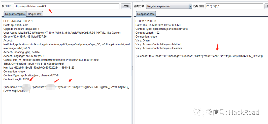 POST /base64 HTTP/1.1Host: api.ttshitu.comUpgrade-Insecure-Requests: 1User-Agent: Mozilla/5.0 (Windows NT 10.0; Win64; x64) AppleWebKit/537.36 (KHTML, like Gecko) Chrome/80.0.3987.149 Safari/537.36Accept: text/html,application/xhtml+xml,application/xml;q=0.9,image/webp,image/apng,*/*;q=0.8,application/signed-exchange;v=b3;q=0.9Accept-Encoding: gzip, deflateAccept-Language: zh-CN,zh;q=0.9Cookie: Hm_lvt_d92eb5418ecf5150abbfe0e505020254=1585994993,1586144399; SESSION=5ebf9c31-a424-44f8-8188-62ca56de7bdf; Hm_lpvt_d92eb5418ecf5150abbfe0e505020254=1586146123Connection: closeContent-Type: application/json; charset=UTF-8Content-Length: 2658{"username":"xxx","password":"xxxxx","typeid":"2","image":"@IMG_RAW>@BASE64>"}