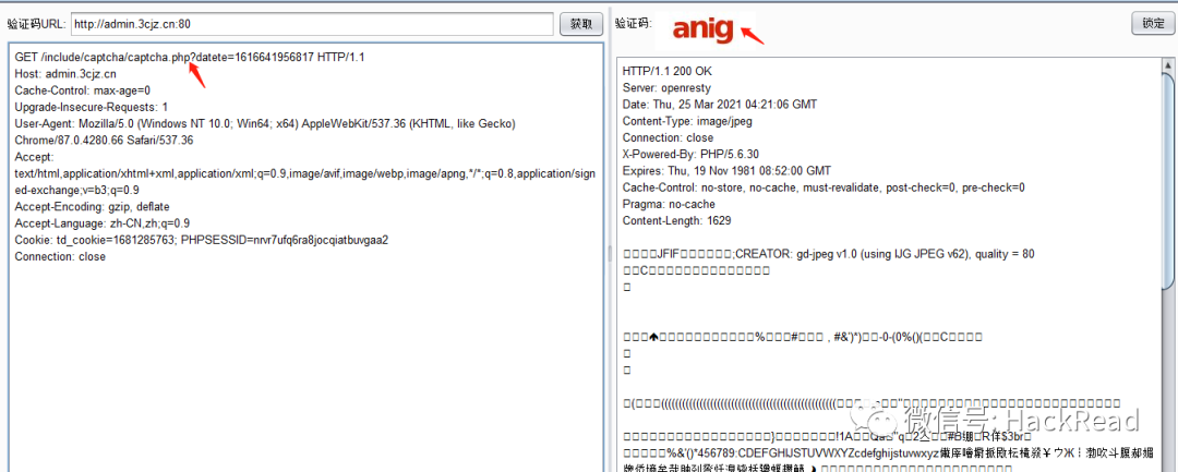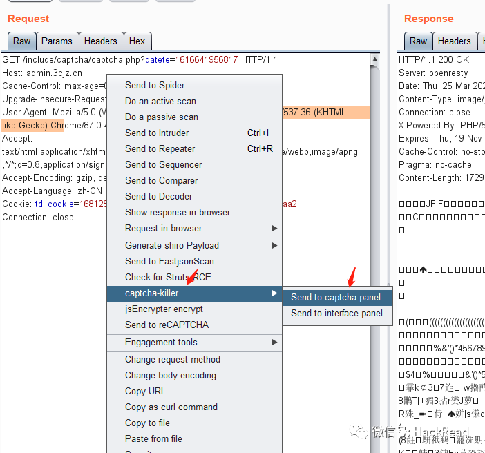 3.然后点击验证码获取验证码的地址,通过buspuit拦截验证码获取地址,然后proxy–proxy history中发送数据包到repeater中,选中它并点击右键选择“send to captcha panel”,这个请求的信息将被发送到captcha-kiler