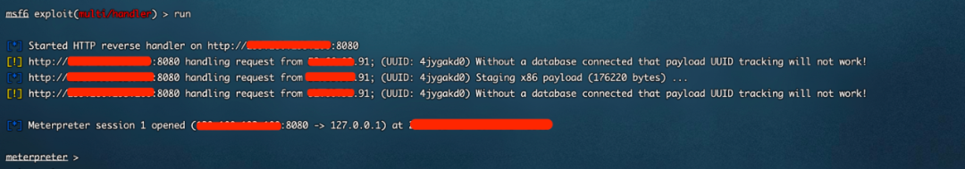 随后吧 CobaltStrike 的 Beacon 互传到了 Metasploit: