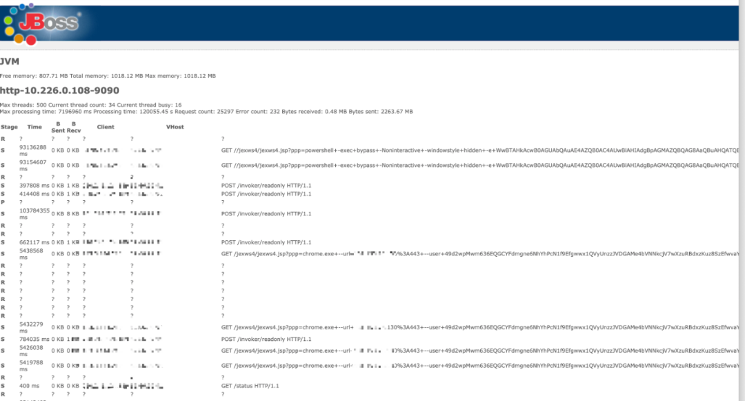 但其实 Jboss 的这个路径可以查看到日志 http://redteam.red:9090/status 发现有日志,已经被上传了 webshell: