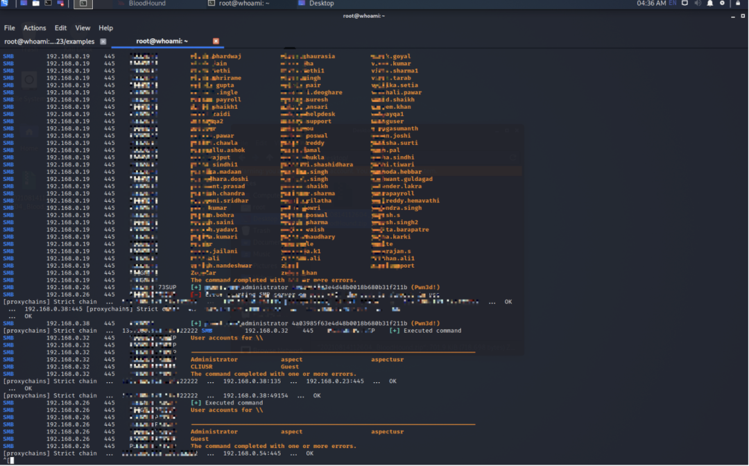 这个时候域内数千多个域用户的 hash 都拿到了,可以进行 pth,此时利用 administrator 的 hash 来对域内机器进行批量执行命令: