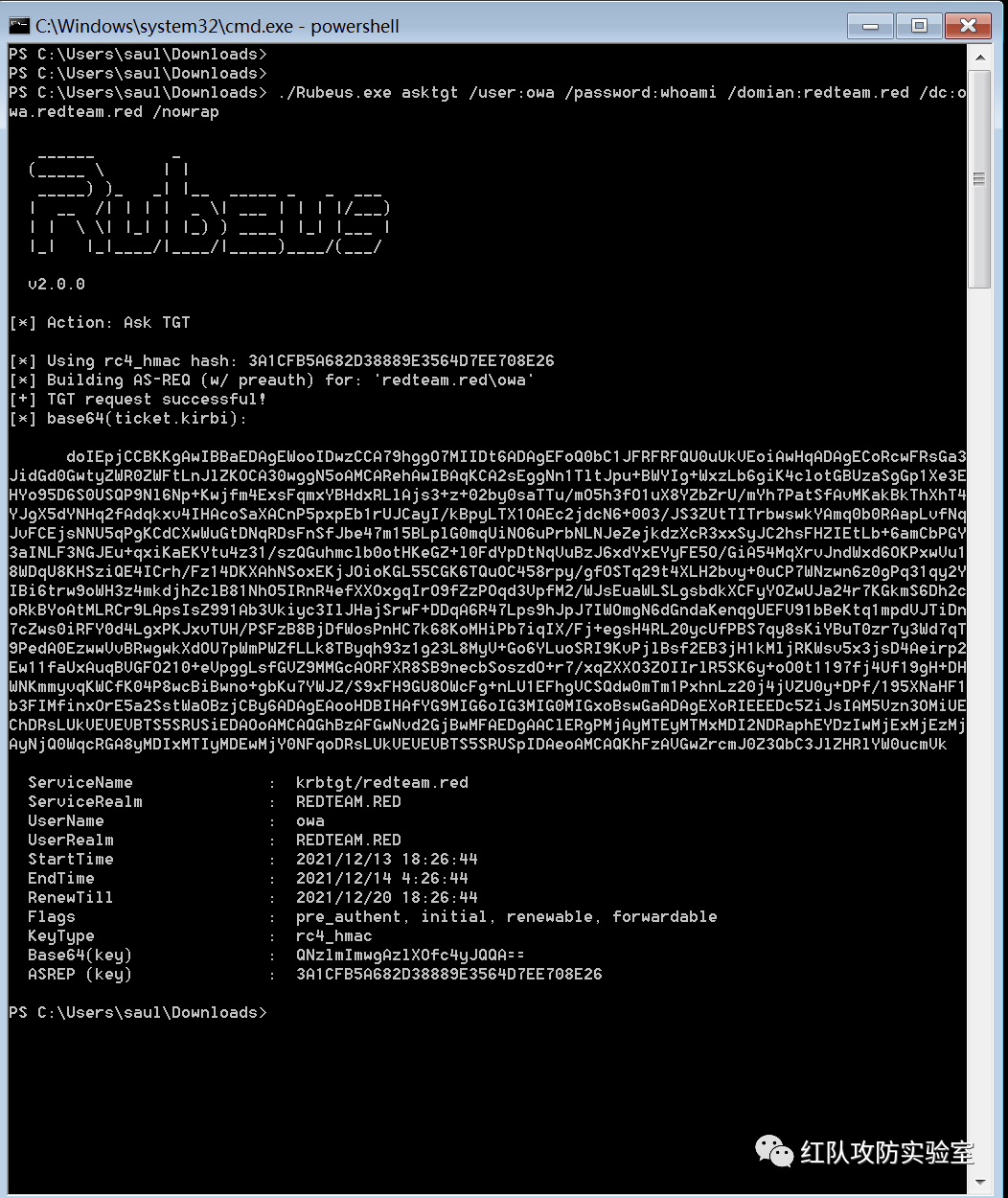 ./Rubeus.exe asktgt /user:owa /password:whoami /domian:redteam.red /dc:owa.redteam.red /nowrap